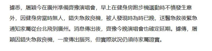 据友人透露,屠颖现在正在广州准备齐豫的演唱会,早上在健身房跑步机运动时不慎发生意外,因健身房当时无人,错失了最佳的抢救时机,被人发现时已经为时已晚,送医院急救后紧急通知家属从台北飞到广州。
