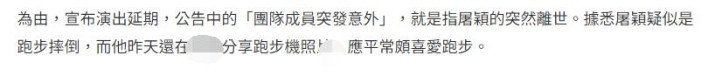 先前周华健在台北小巨蛋开唱时,曾特别介绍自己的音乐总监就是屠颖,两人好交情不在话下;另他最近也跟着齐豫巡演,今早他还在社交软件发文,岂料晚间传出离世噩耗,齐豫演出也紧急宣布延期。