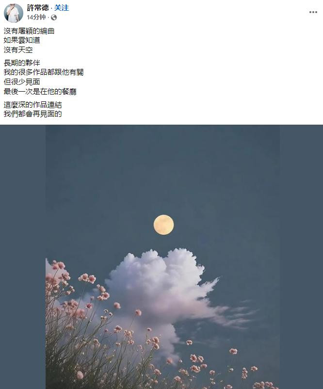 这场突发意外,让许多好友难以接受,纷纷发文送别,陈子鸿也悲痛表示“45年的老友,屠颖老师一路好走”,许常德也感叹“没有屠颖的编曲,如果云知道,没有天空。长期的伙伴,我的很多作品都跟他有关,但很少见面,最后一次是在他的餐厅,这么深的作品连接,我们都会再见面的”。